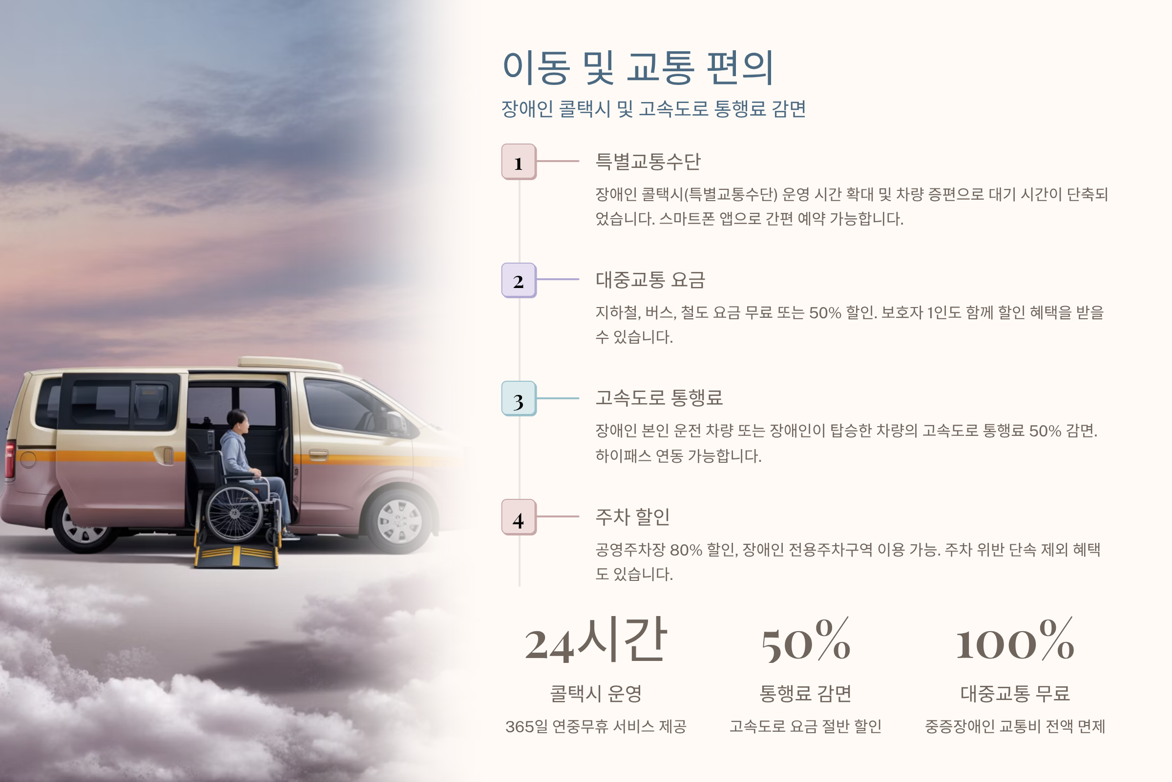 이동권은 사회 참여의 첫걸음입니다. 2025년 **장애인 복지혜택**에서는 교통 약자의 이동 편의를 증진하기 위한 지원이 더욱 강화됩니다. 가장 체감도가 높은 **장애인 콜택시 및 특별교통수단**의 운행 대수가 확충되고, 대기 시간이 단축될 수 있도록 정부와 지자체의 노력이 집중됩니다. 특히, 야간 및 주말 운행 확대를 위한 인력 지원 예산이 늘어나, 출퇴근 시간 외의 이동 불편이 크게 해소될 것으로 예상됩니다. **고속도로 통행료 감면 혜택**의 경우, 기존의 등록 차량 기준을 유지하되, 감면 적용을 위한 온라인 인증 시스템이 더욱 간편해질 전망입니다. 또한, 유류세 감면 혜택을 받는 차량의 배기량 기준이 확대되거나, LPG 차량 지원 기준이 완화되는 등의 정책 변화가 논의되고 있습니다. (수치·정책은 추정치 표기 시 확인 필요) 중요한 것은 모든 교통 복지혜택은 장애인 등록증(복지카드) 소지 여부와 차량 등록 기준을 엄격하게 적용하므로, 변경되는 규정을 정확히 숙지해야 합니다.