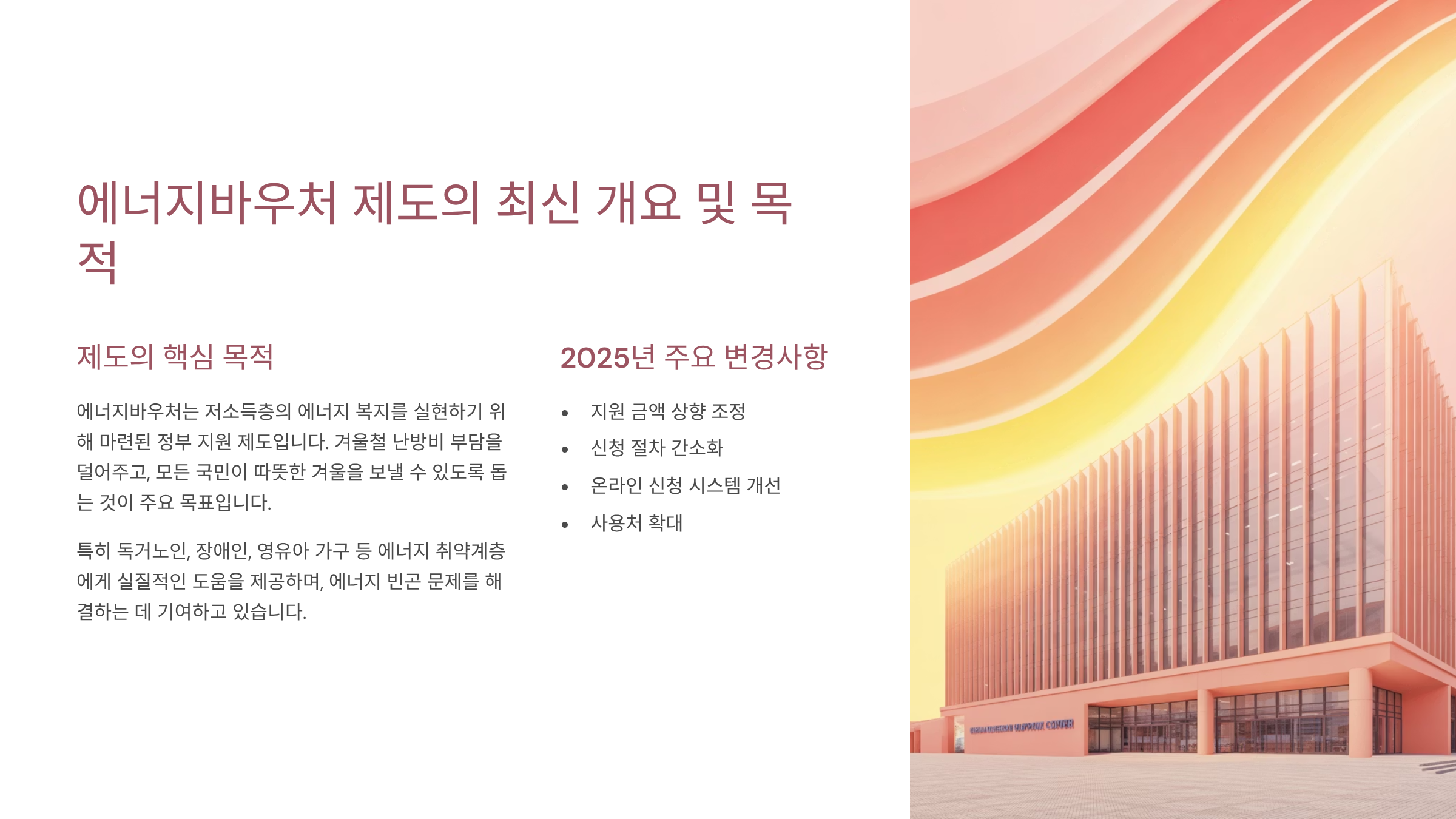 매년 겨울철마다 에너지 취약계층의 따뜻한 생활을 지원하기 위해 정부가 제공하는 핵심 복지 제도가 바로 **에너지바우처**입니다. 최근 몇 년간 지속된 에너지 비용 상승으로 인해 이 바우처의 중요성은 더욱 커지고 있죠. 2025년에도 이 제도는 저소득 가구의 냉·난방 부담을 실질적으로 경감하는 데 초점을 맞추고 있습니다. 특히, 올해는 지원 대상 기준이 일부 확대되고 절차가 간소화되는 등 여러 변화가 예상되고 있어 최신 정보를 정확히 파악하는 것이 중요합니다. 이 가이드에서는 **에너지바우처 신청 대상**은 물론, 가구별 **지원 금액**, 그리고 **온라인 및 방문 신청의 모든 절차**를 누구나 쉽게 이해하고 바로 적용할 수 있도록 상세하게 다루겠습니다. 이 글을 통해 필수 정보를 얻고, 따뜻한 계절을 준비하세요. (공백 포함 약 250자)