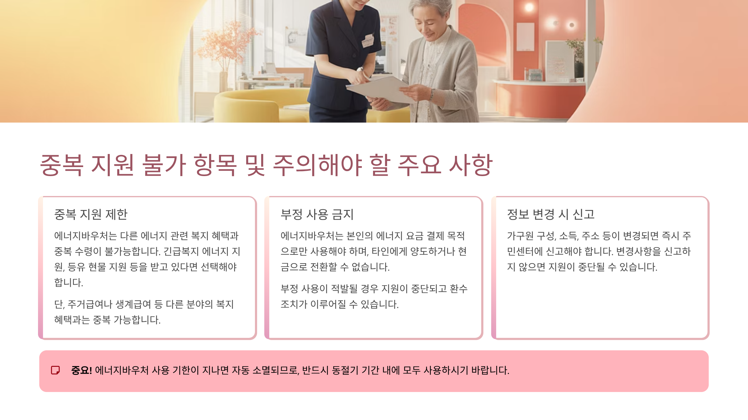 에너지바우처를 신청할 때 가장 주의해야 할 부분은 바로 **중복 지원 불가 항목**입니다. 정부나 지자체에서 시행하는 다른 난방비 또는 에너지 지원 사업과 중복 수혜가 될 경우, 바우처 지급이 취소되거나 금액이 조정될 수 있습니다. 대표적으로 **긴급 복지 지원 중 동절기 연료비**, **연탄 쿠폰 지원 사업**, **등유 나눔 사업** 등의 수혜자들은 원칙적으로 에너지바우처를 중복해서 받을 수 없습니다. 또한, 세대원 중 이미 다른 에너지 복지 혜택(예: 전기요금 복지할인)을 받고 있더라도 바우처 신청은 가능하나, 중복 여부를 최종적으로 확인하여 조정될 수 있습니다. **허위 또는 부정 신청**을 할 경우, 지원금 환수는 물론 관련 법규에 따라 처벌을 받을 수 있으니, 모든 정보는 반드시 사실에 근거해야 합니다.