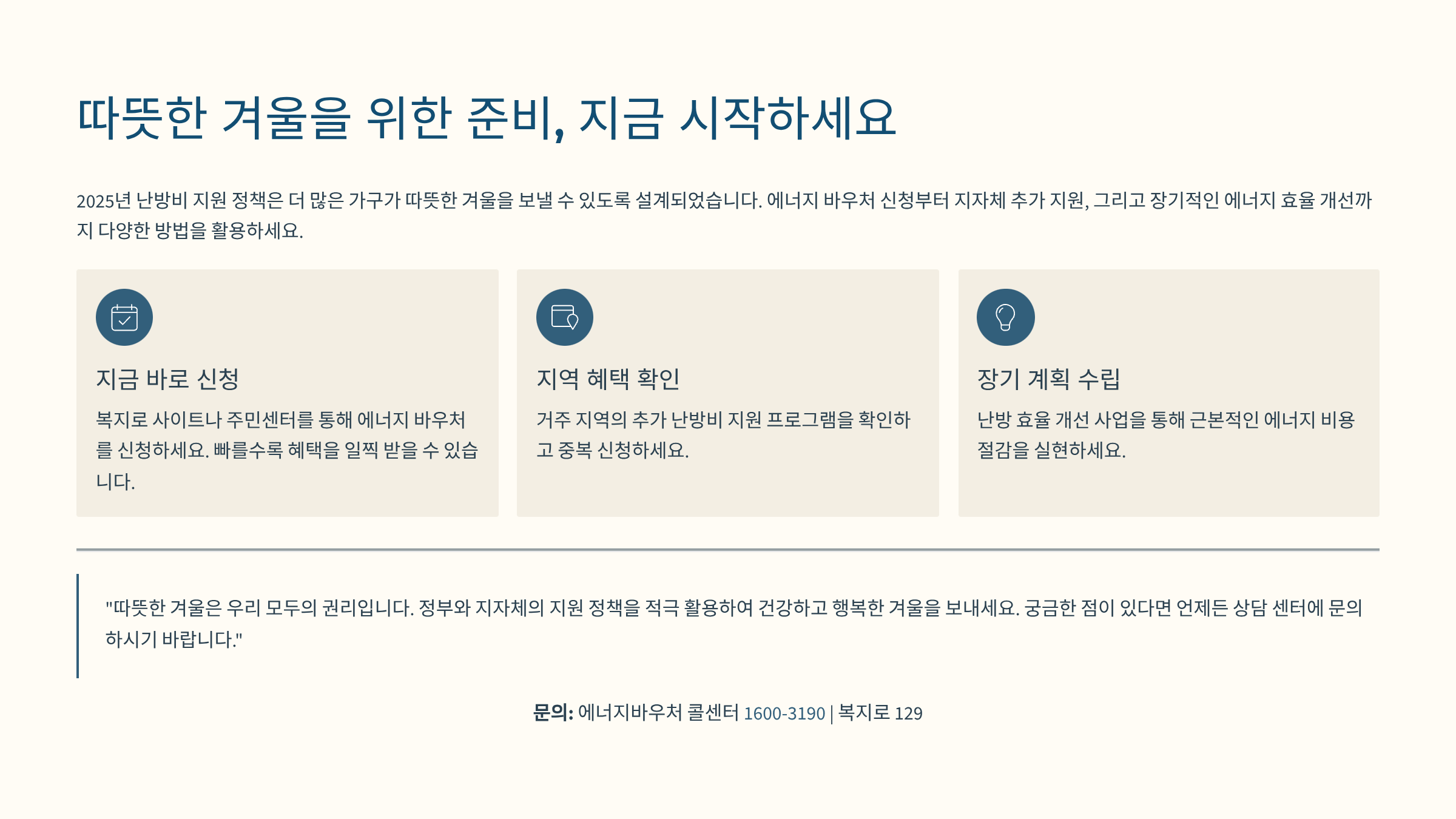 이 글이 2025년 난방비 지원 정책을 이해하고 필요한 모든 혜택을 찾는 데 도움이 되었기를 바랍니다. 정부와 지자체의 정책은 매년 세부 내용이 조금씩 달라질 수 있으니, 궁금한 점이 있다면 주저하지 말고 관할 주민센터나 복지 관련 문의처에 확인해 보세요. 모두 안전하고 따뜻한 겨울 보내시길 응원합니다! 😊