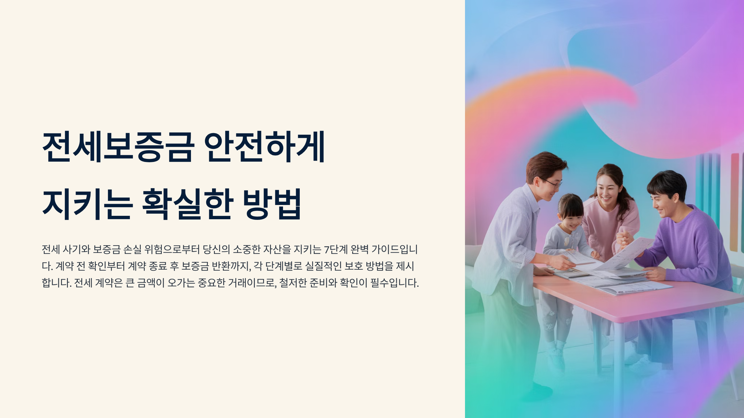 💡 대한민국에서 전세는 가장 보편적인 주거 형태 중 하나이지만, 전세사기와 깡통전세 위험 증가로 인해 세입자의 **보증금 보호**에 대한 불안감이 극에 달하고 있습니다. 보증금은 개인의 가장 큰 자산 중 하나이기에, 계약 전 신중한 검토부터 입주 후 확정일자, 전세보증금 반환보증보험 가입까지 빈틈없는 안전장치가 필수적입니다. 이 글은 최신 법률과 제도, 전문가의 조언을 종합하여, 소중한 **전세보증금을 100% 안전하게 지킬 수 있는** 실질적이고 구체적인 7단계 핵심 가이드를 제공합니다. 지금부터 이 가이드를 따라 소중한 자산을 보호하세요. 📝
