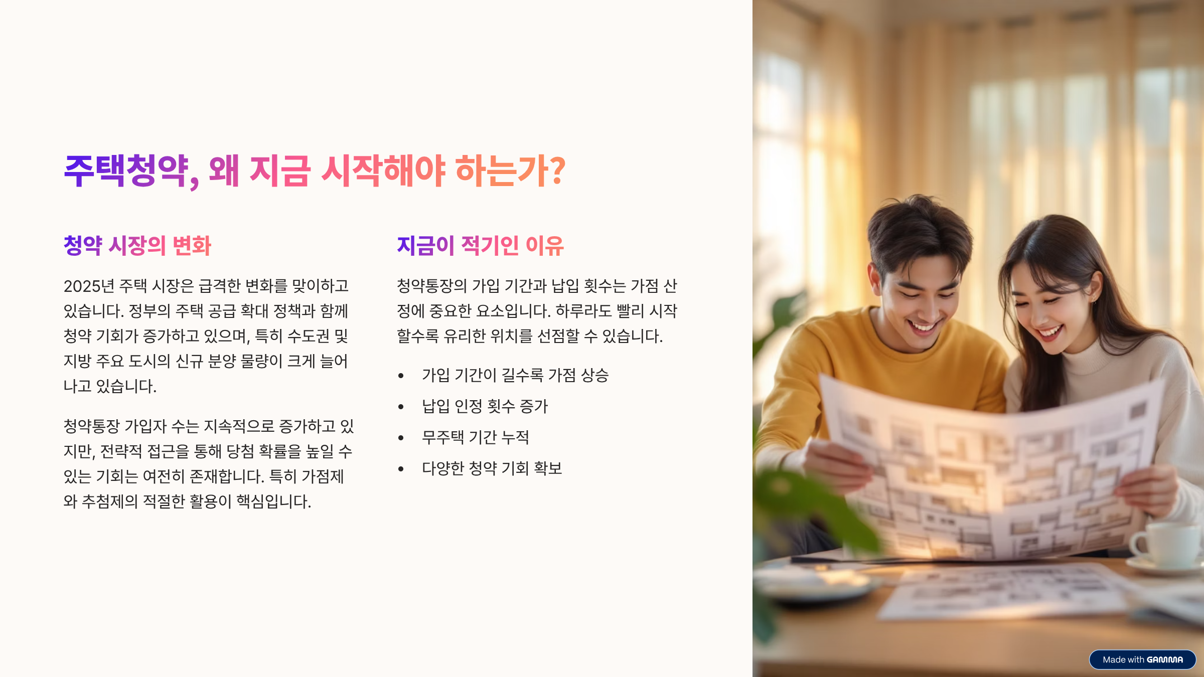 내 집 마련의 꿈, 주택청약은 더 이상 남의 이야기가 아닙니다. 부동산 시장의 불확실성이 커지는 지금, 가장 확실하고 투명한 방법으로 내 집을 얻는 길은 바로 '주택청약'입니다. 2025년에는 무주택자 및 신혼부부 등 실수요자를 위한 정책적 변화가 예고되면서, 청약 시장에 대한 관심이 더욱 뜨거워지고 있습니다. 단순히 운에 기대는 것이 아닌, 철저한 분석과 전략이 필요한 시점입니다. 이 가이드에서는 최신 개정된 청약 제도부터 가점제 분석, 그리고 지역별 전망까지, 청약 성공에 필요한 모든 정보를 집약적으로 담아냈습니다. 지금 바로 주택청약의 전문가가 되어보세요!
