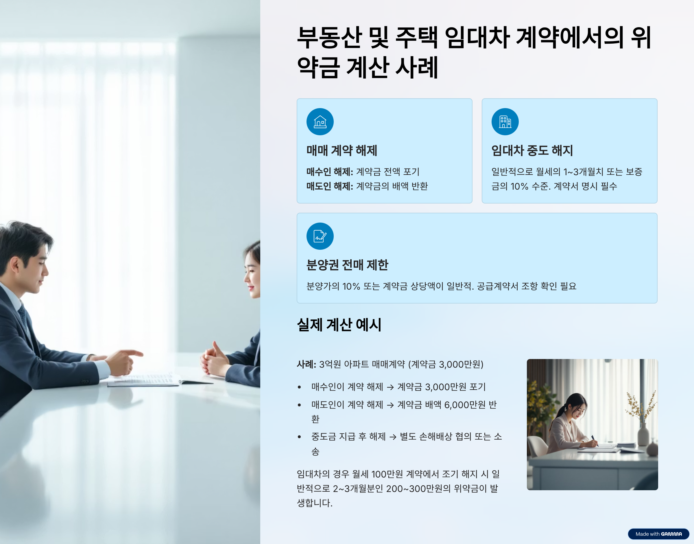 계약서에 서명하는 순간, 우리는 약속을 이행할 의무를 집니다. 하지만 불가피한 사정으로 계약을 파기해야 할 때, 가장 먼저 머릿속을 복잡하게 만드는 것이 바로 '위약금 계산법'입니다. 부동산 매매, 주택 임대차, 심지어 여행 계약까지, 모든 법적 약속에는 위약금 조항이 숨어있죠. 단순히 계약금 포기라는 상식만으로는 해결되지 않는 복잡한 법적 쟁점과 계산 원리가 존재합니다. 이 글은 민법과 각종 특별법에 근거한 위약금의 정확한 개념과 산정 기준을 일반인이 쉽게 이해할 수 있도록 명쾌하게 정리했습니다. 지금부터 불확실했던 손해배상액을 명확히 예측하는 방법을 함께 알아보겠습니다.