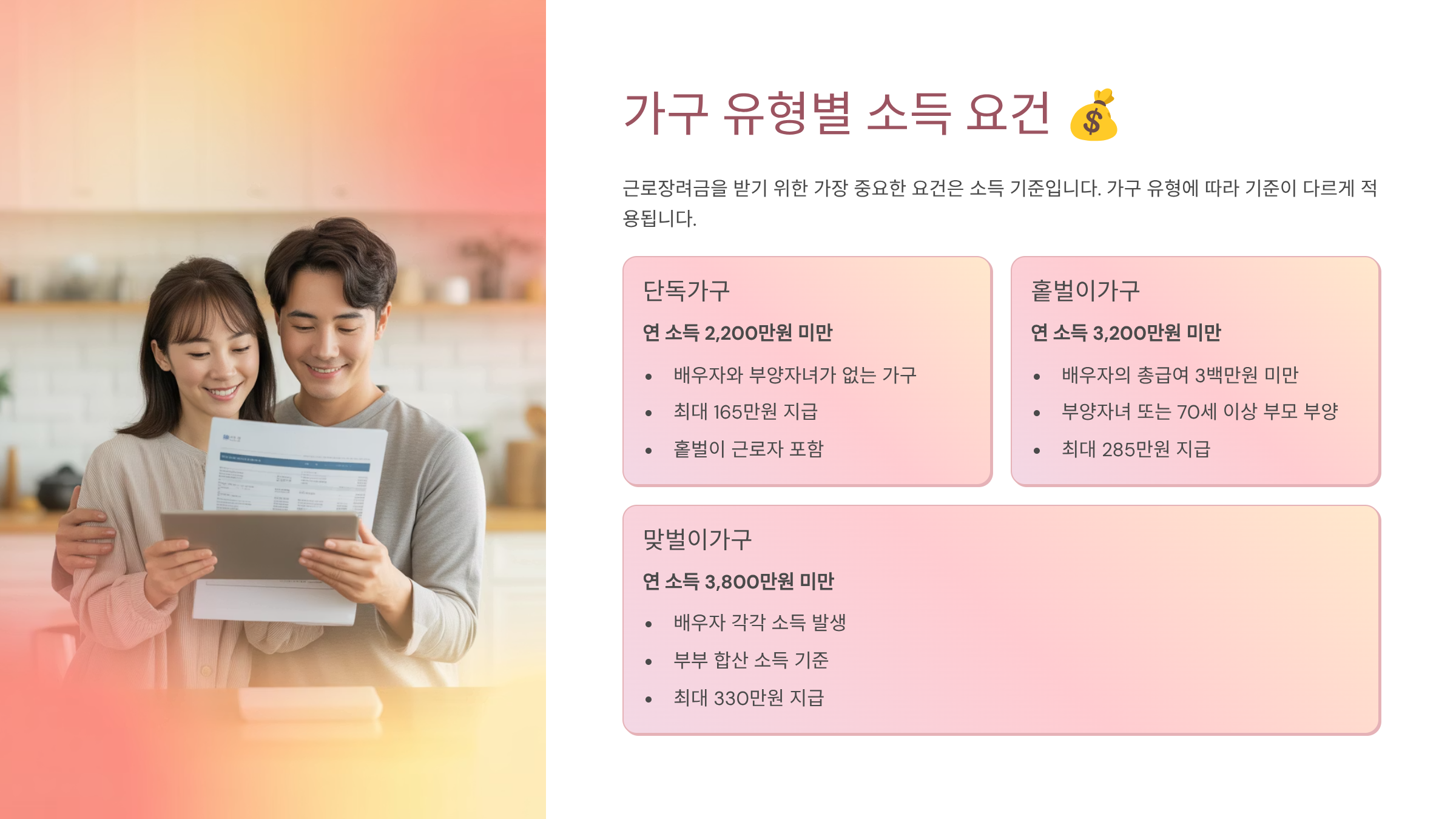 '단독가구'는 배우자, 부양자녀, 70세 이상 직계존속이 모두 없는 가구입니다. '홑벌이가구'는 배우자(배우자 총급여액 등 300만원 미만)나 부양자녀 또는 70세 이상 직계존속 중 하나라도 있는 가구입니다. 마지막으로 '맞벌이가구'는 신청인과 배우자 각각의 총급여액 등이 300만원 이상인 가구입니다. 이 기준을 통해 가구 유형을 확정한 후, 아래 표를 통해 본인의 총소득이 기준금액 미만인지 확인해야 합니다. 만약 소득이 상한선을 넘는다면 안타깝게도 장려금 신청 자격이 없습니다.