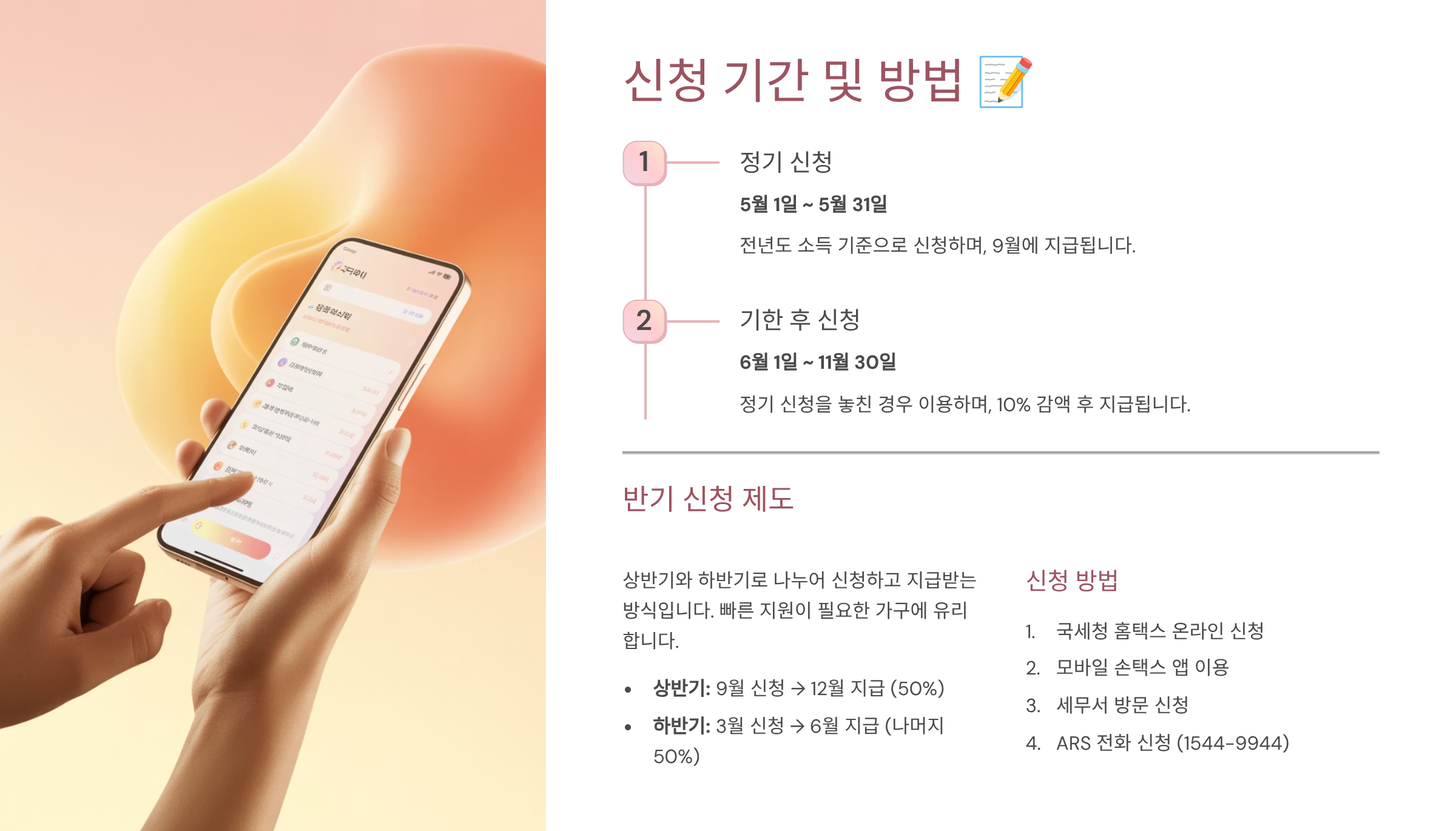 신청 방법은 매우 간편합니다. 국세청에서 모바일 안내문, 문자메시지, 또는 우편으로 안내문을 받은 경우, 안내문에 포함된 QR코드나 모바일 링크, ARS 전화(1544-9944)를 통해 손쉽게 신청할 수 있습니다. 안내문을 받지 않았더라도 홈택스(PC 또는 모바일 앱)에 접속하여 본인이 자격 요건을 충족하는지 확인 후 직접 신청할 수 있습니다. 최근 자동신청 제도가 모든 연령으로 확대되었으므로, 안내 대상자라면 한 번의 동의로 2년간 자동 신청 혜택을 받을 수 있습니다. (확인 필요) 이러한 편리한 방법을 활용하여 기한 내에 꼭 신청해야 감액 없이 전액을 수령할 수 있습니다.