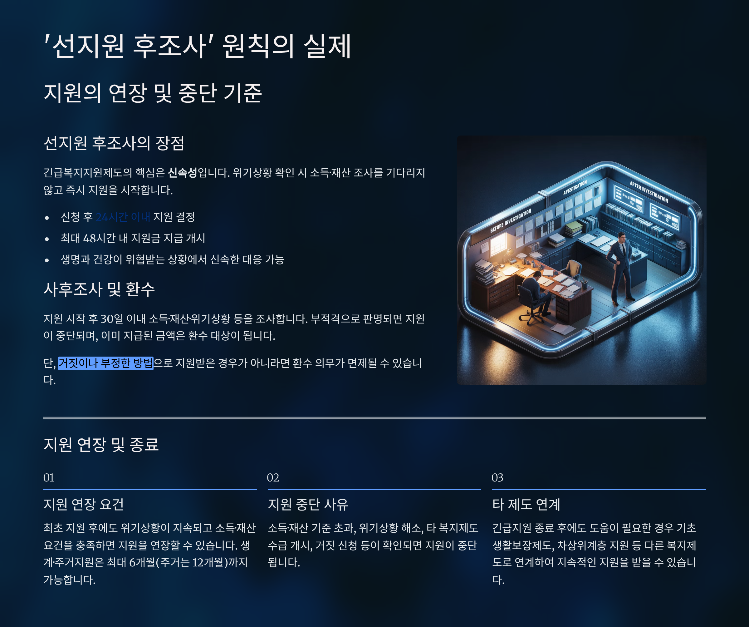 긴급복지지원제도의 근간인 **'선지원 후조사'**는 위기 상황에 대한 즉각적인 대응을 가능하게 하지만, 동시에 **사후 심사**의 중요성을 높입니다. 지원이 시작된 후에는 소득, 재산, 금융 정보 등에 대한 정밀 조사가 진행되며, 이 결과가 긴급복지지원 선정 기준을 초과하는 것으로 밝혀지거나, 위기 상황이 해소된 것으로 판단되면 지원이 중단되거나 이미 지급된 지원금이 **환수**될 수 있습니다. 따라서 신청 시에는 위기 사유와 소득·재산 정보를 사실대로 정확하게 신고하는 것이 매우 중요합니다. 지원 기간의 연장이 필요한 경우에는 **긴급지원심의위원회**의 심의를 거쳐 최대 지원 기간(생계지원 6개월, 주거지원 12개월 등) 범위 내에서 추가 지원 여부가 결정됩니다.